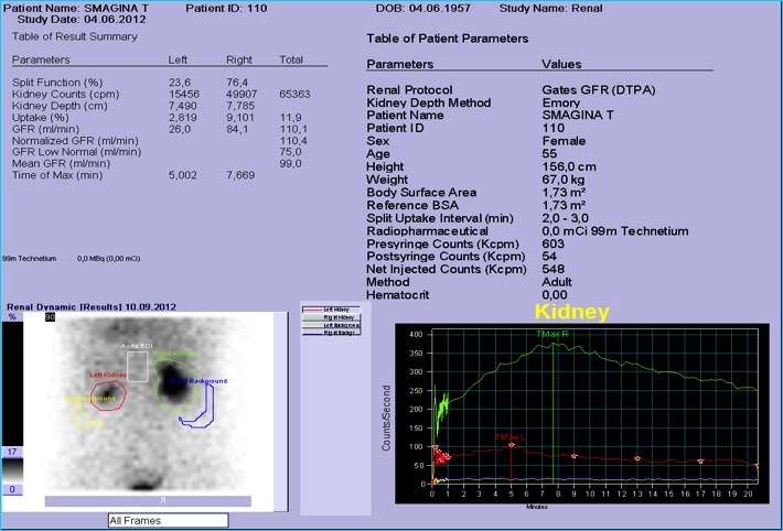 Principles: The test is performed after the imaging agent is injected in the basilic vein. Images of the kidneys are taken continuously for at least 20 minutes. The obtained functional information is analyzed by a special software program that builds an ‘activity v. time’ graph and allows assessment of the filtrating (secreting) and excreting function of the kidneys.