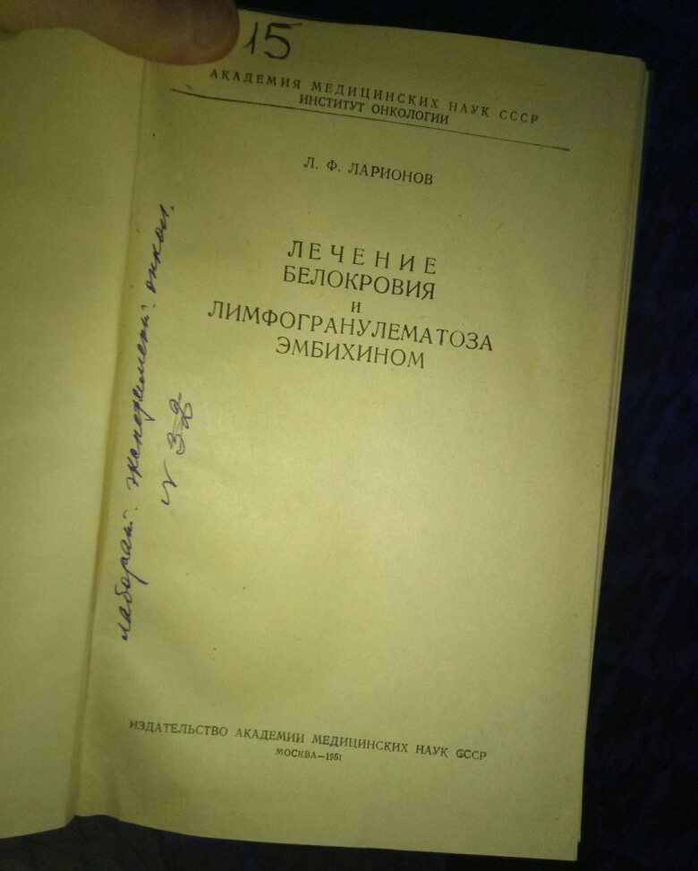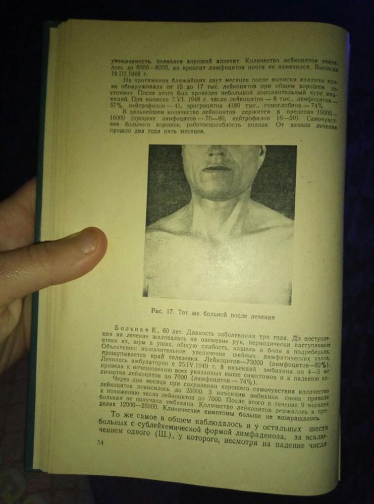 В монографии Л.Ф. Ларионова «Лечение белокровия и лимфогранулематоза эмбихином», вышедшей в 1951 году, описан этот случай: