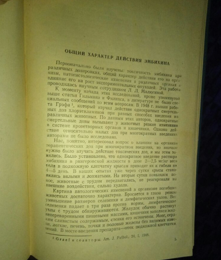 Клиническое наблюдение: «Больной С., 49 лет, поступил в НИИ онкологии 08.12.1947 года с жалобами на слабость, быструю утомляемость, значительную потливость и похудание. Периферические лимфатические узлы во всех областях (шейные, подчелюстные, подбородочные, подмышечные, паховые) увеличены, некоторые до 4 см в диаметре. Лейкоцитоз – 35 тыс. при 78% лимфоцитов. Гистологическое исследование удаленного узла подтвердило диагноз лимфаденоза. Больному было сделано 30 введений эмбихина по 3 раза в неделю в дозе 4-5 мг. Все лимфатические узлы значительно уменьшились, некоторые почти перестали прощупываться. Полностью прекратились клинические симптомы. Выписан 19.03.1948г. Затем через 2 месяца последовал очередной цикл химиотерапии. При выписке 07.06.1948 г. клинический анализ нормализовался. В дальнейшем число лейкоцитов держится в пределах 10.000-16.000 тыс. (процент лимфоцитов 70-80, нейтрофилов 16-20). От начала лечения прошло два года и пять месяцев».