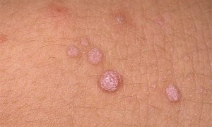 Вульгарные бородавки – плотные, слегка возвышающиеся, бугорки от 3 мм до 1 см. Розового или телесного цвета, могут шелушиться. Часто множественные.