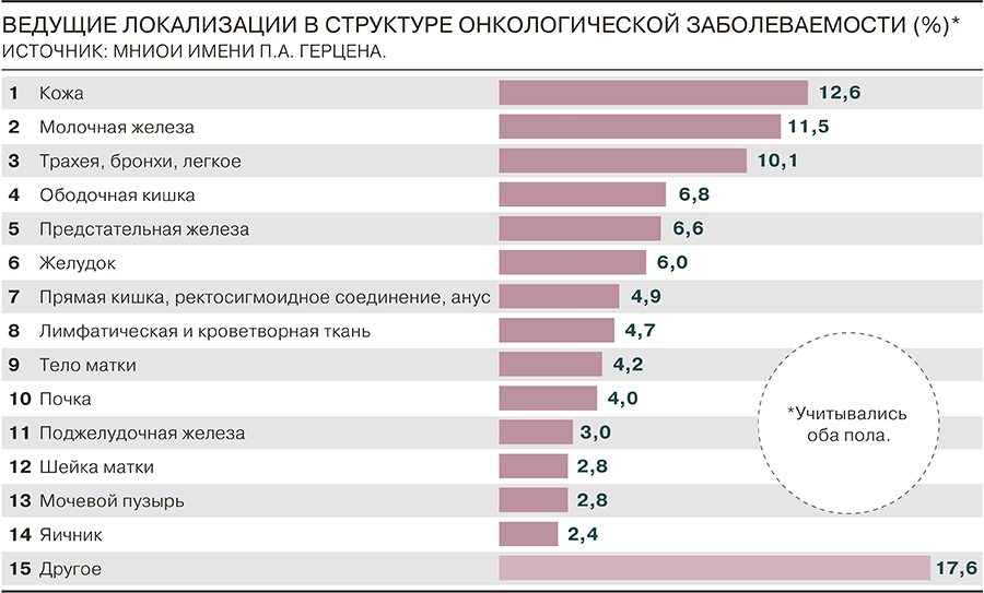 Окончательной статистики по 2018 году пока нет. По данным ежегодного доклада Московского научно-исследовательского онкологического института имени П. А. Герцена, в 2017 году в России выявлено 617 177 случаев злокачественных новообразований (281 902 — у пациентов мужского пола, 335 275 — у пациентов женского пола). Прирост по сравнению с 2016 годом составил 3%. На конец 2017 года в территориальных онкологических учреждениях России на учете состояли более 3,6 млн человек, на конец 2016 года — более 3,5 млн человек.