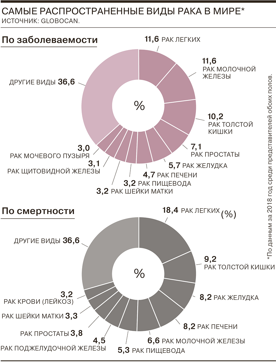 В 2005 году 4 февраля было объявлено Всемирным днем борьбы против рака. Онкологические заболевания являются одной из основных причин смерти в мире: в 2018 году, по прогнозам Всемирной организации здравоохранения (ВОЗ), сделанным в конце прошлого года, от рака умерли 9,6 млн человек. По расчетным данным проекта GLOBOCAN (база данных по онкозаболеваниям Международного агентства исследований рака и ВОЗ), опубликованным в сентябре 2018 года, в прошлом году заболеть должны были более 18 млн человек. В России рак диагностируют более чем у 500 тыс. человек в год. По просьбе “Ъ” члены Российского общества клинической онкологии (RUSSCO) рассказали о наиболее актуальных для России видах заболевания и оценили шансы на их эффективное лечение.