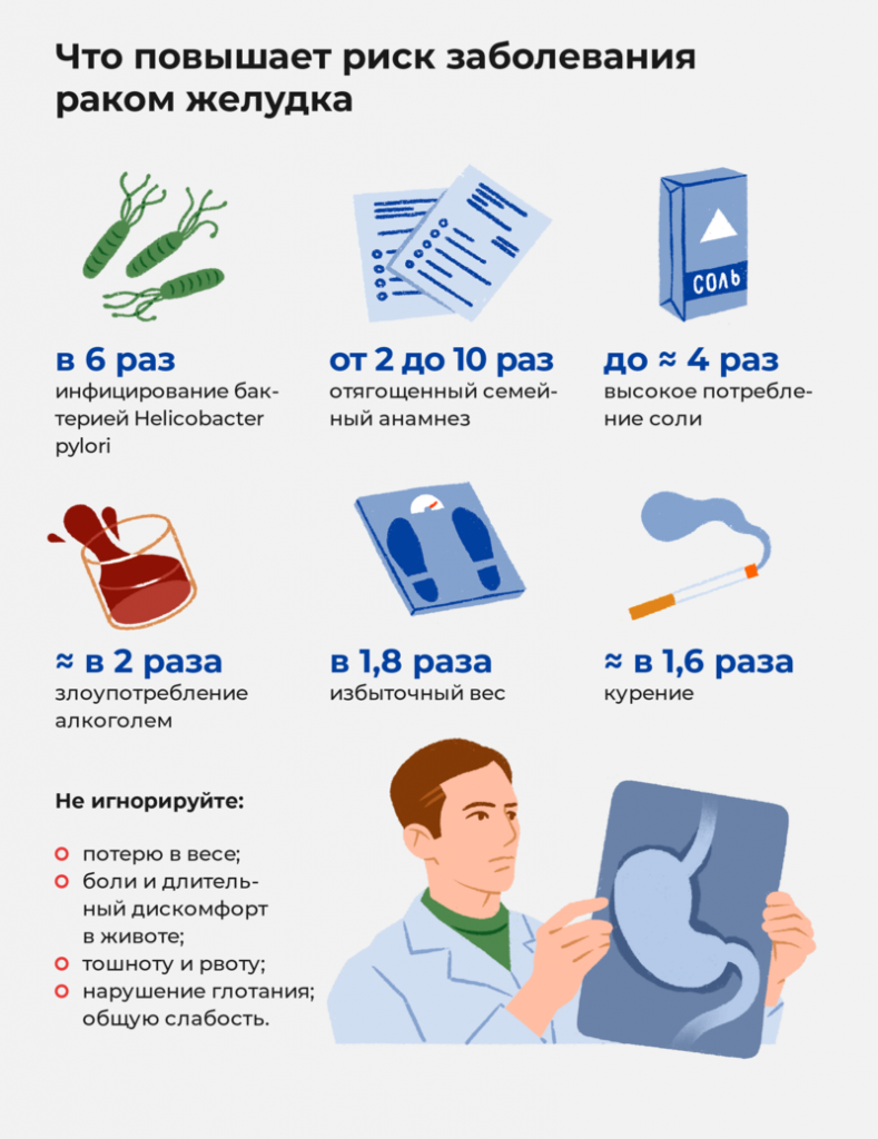 По данным исследований, курение, злоупотребление алкоголем, нерациональное питание (например, в рационе много соли и красного мяса, но мало фруктов и овощей), а также недостаточная физическая активность со временем приводят к тому, что в число самых распространенных злокачественных новообразований у мужчин и женщин входят рак желудка и кишечника.