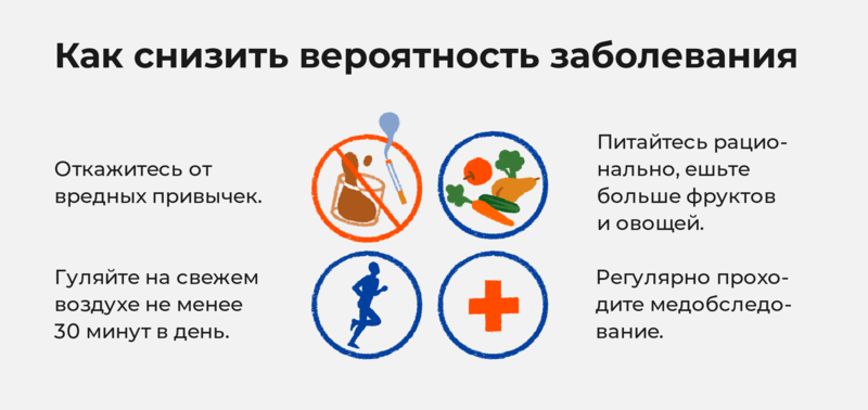 Все просто: чем больше факторов риска одновременно воздействуют на организм человека, тем сильнее повышается вероятность заболевания. Некоторые из этих воздействий можно устранить (бросить курить) или скорректировать (есть больше овощей), и тогда риск закономерно будет снижаться. На некоторые факторы повлиять не получится, как не получится переписать семейную историю или повернуть время вспять, и в этом случае главным оружием в борьбе за здоровье станет внимание к своему самочувствию и регулярные осмотры у врача.