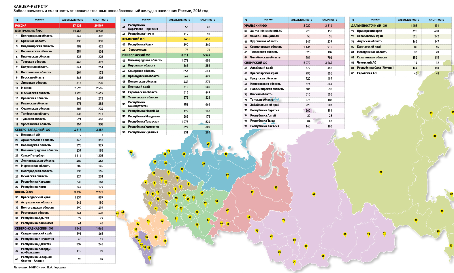 По данным МНИОИ им. П.А. Герцена, рак желудка в 2016 году (последние доступные сведения) был впервые диагностирован у 37 135 россиян, что заметно отличается от показателей 2006 года, когда количество новых диагнозов достигало почти 42 тысяч. В десятилетней ретроспективе можно заметить и снижение смертности: в 2006 году от рака желудка в стране погибли 37 360 онкопациентов, в 2016 году – 29 549 больных (подробнее – на карте «Канцер‑регистр).