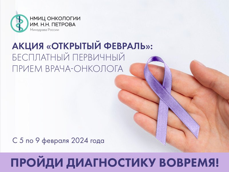 С 5 по 9 февраля в НМИЦ онкологии им. Н.Н. Петрова пройдет акция «Открытый февраль», приуроченная к Всемирному дню борьбы против рака. Врачи-онкологи проведут бесплатные первичные приемы.