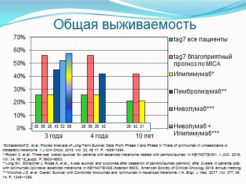 Для группы больных с благоприятным прогнозом, отобранной в соответствии с разработанными критериями, медиана общей выживаемости в два раза превосходила таковую для пациентов, получавших современные иммунотерпевтические таргетные препараты (ниволумаб, ипилимумаб, пембролизумаб и их комбинации).