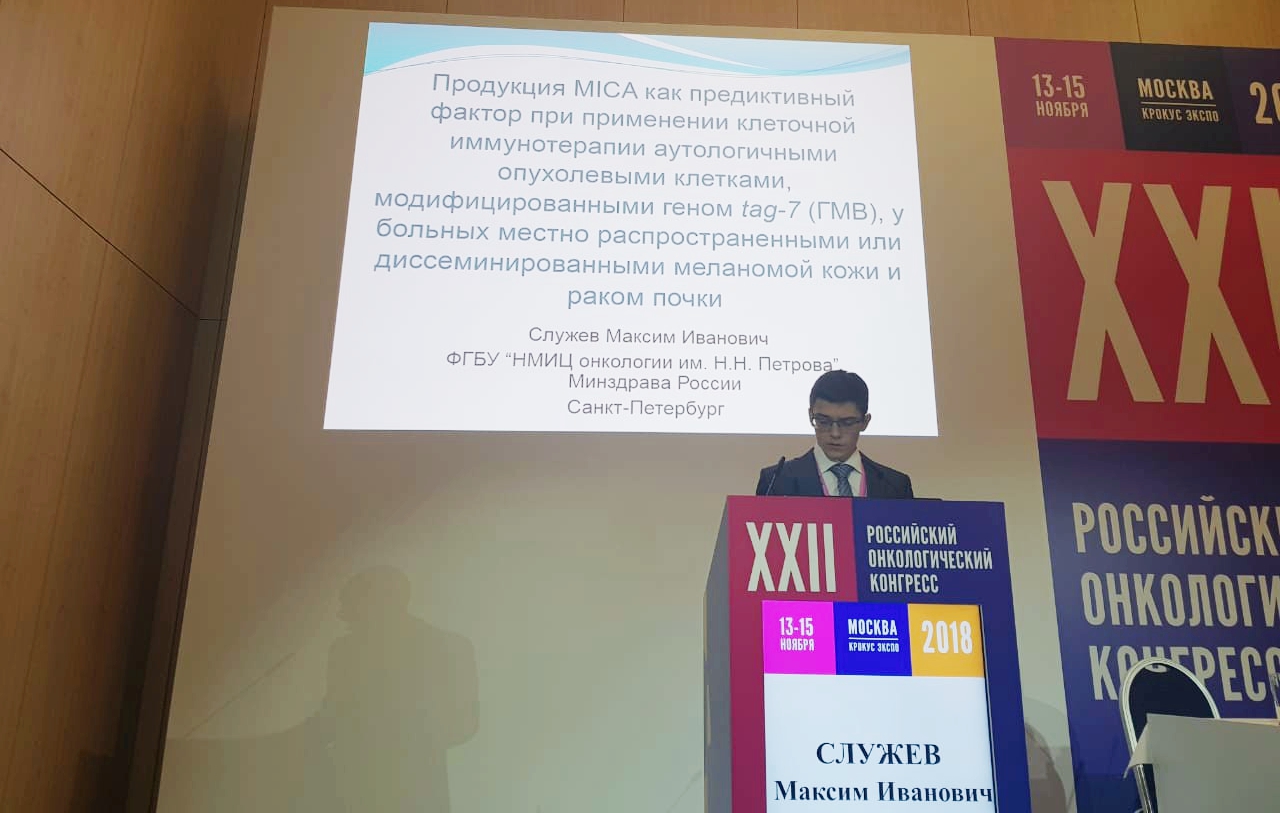 Дата публикации: 13.11.2018На Всероссийском конкурсе молодых ученых в рамках ХХII Российского онкологического конгресса'2018 ординатор 2-го года ФГБУ НМИЦ онкологии им. Н.Н. Петрова Минздрава России Максим Иванович Служев представил исследование на тему: "Продукция MICA как предиктивный фактор при применении клеточной иммунотерапии аутологичными опухолевыми клетками, модифицированными геном tag-7 (ГМВ), у больных местно распространенными или диссеминированными меланомой кожи и раком почки", научный руководитель к.б.н. Данилова А.Б., научный консультант д.м.н. Балдуева И.А.
