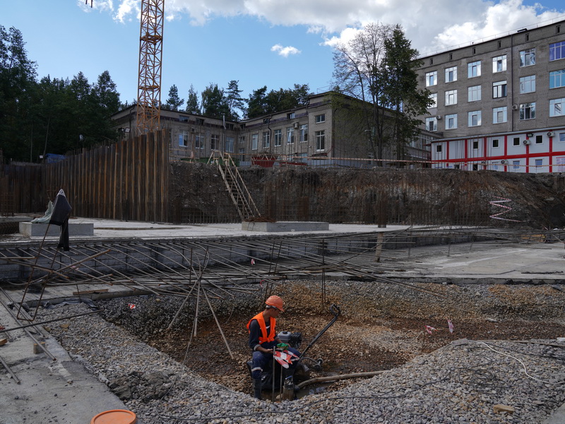 В фундамент будущего клинического корпуса Центра онкологии им. Н.Н. Петрова на сегодняшний день залили уже 1000 м³ бетона, что является третью всего объёма работ по заливке. К началу сентября этого года фундамент будет залит полностью.