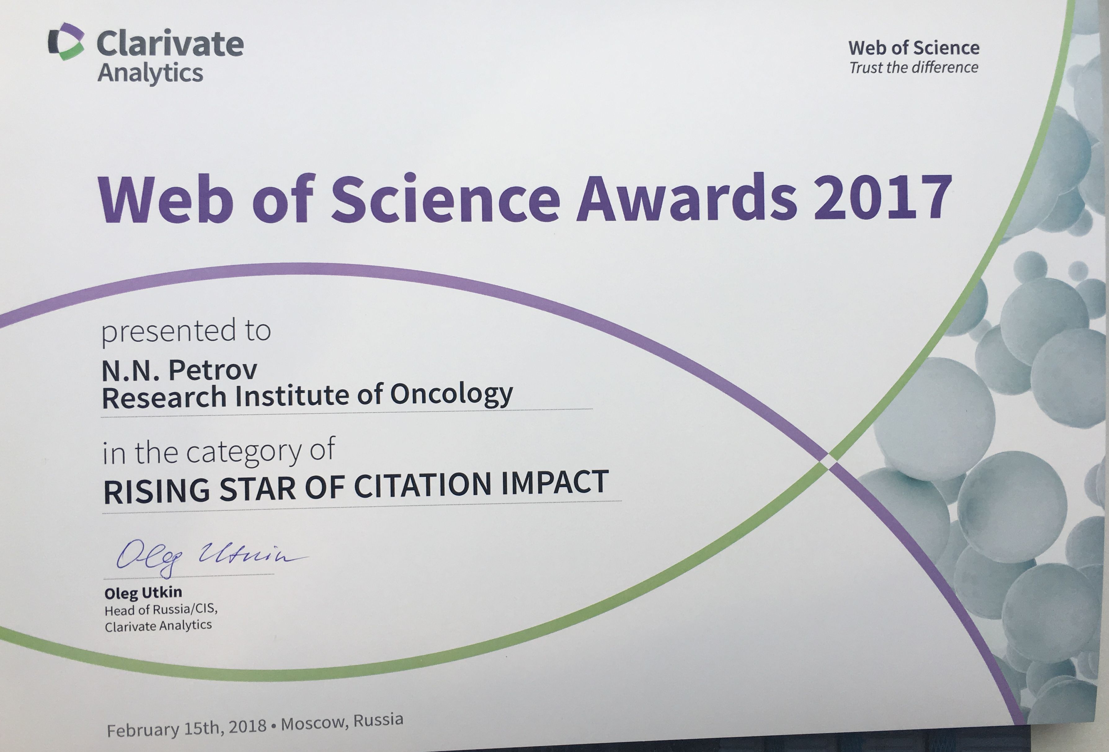НМИЦ онкологии им. Н.Н. Петрова - лауреат премии Web of Science Awards Russia