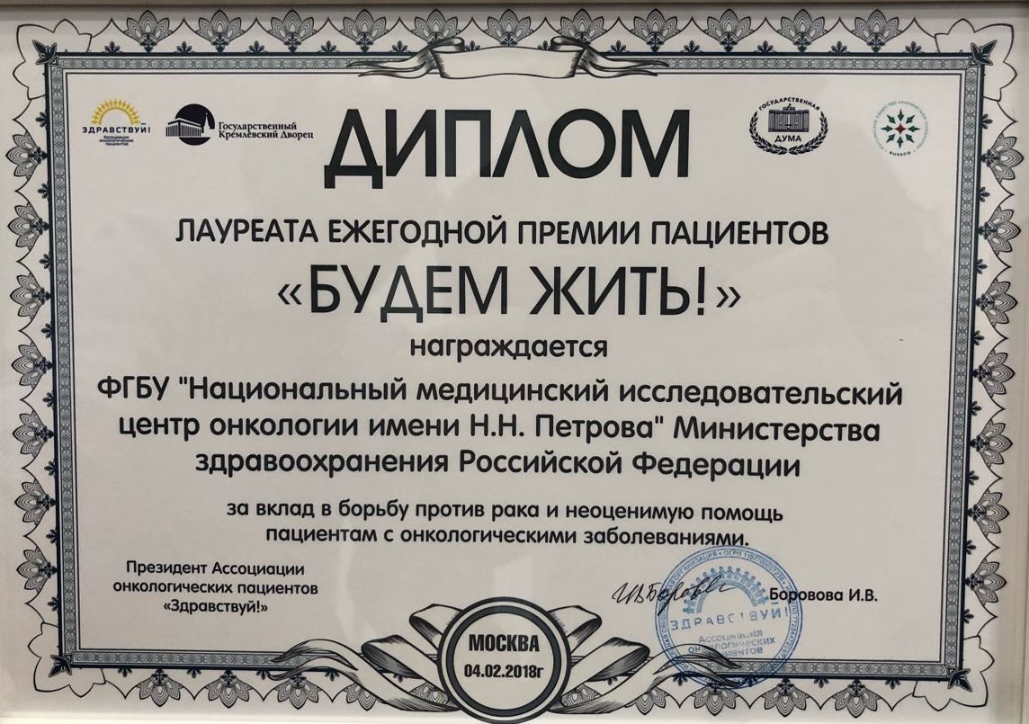 ФГБУ «НМИЦ онкологии им. Н.Н. Петрова» Минздрава России стал победителем Всероссийской пациентской премии «Будем жить!» в номинации «Лучшие онкологические клиники страны» за сохранение традиций российской медицины, где наука и практика не разделимы, где пациенты находятся в надежных руках». Еще одним лауреатом премии названо 14 отделение ГБУЗ «Морозовская детская городская клиническая больница Департамента здравоохранения города Москвы». Всего же премии вручены более, чем в двадцати номинациях. В числе награжденных не только онкологические медицинские учреждения, но и врачи-онкологи, благотворительные фонды, волонтеры, пациенты.