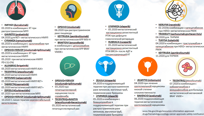 Наибольшее количество препаратов были одобрены FDA для лечения немелкоклеточного рака легких, регистрация которых ожидается в РФ.