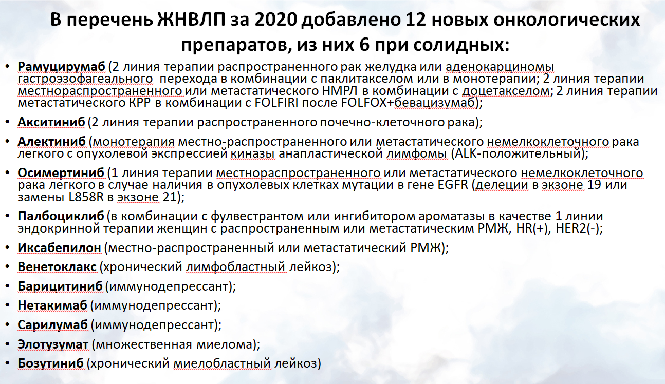 1. Перечень ЖНВЛП в 2020 году пополнился 12 противоопухолевыми лекарственными средствами. При солидных опухолях применяются 6 препаратов: иксабепилон, рамуцирумаб, акситиниб, алектиниб, осимертиниб, палбоциклиб. При онкогематологических заболеваниях - 6 новых препаратов: венетоклакс, барицитиниб, нетакимаб, сарилумаб, элотузумат, бозутиниб.