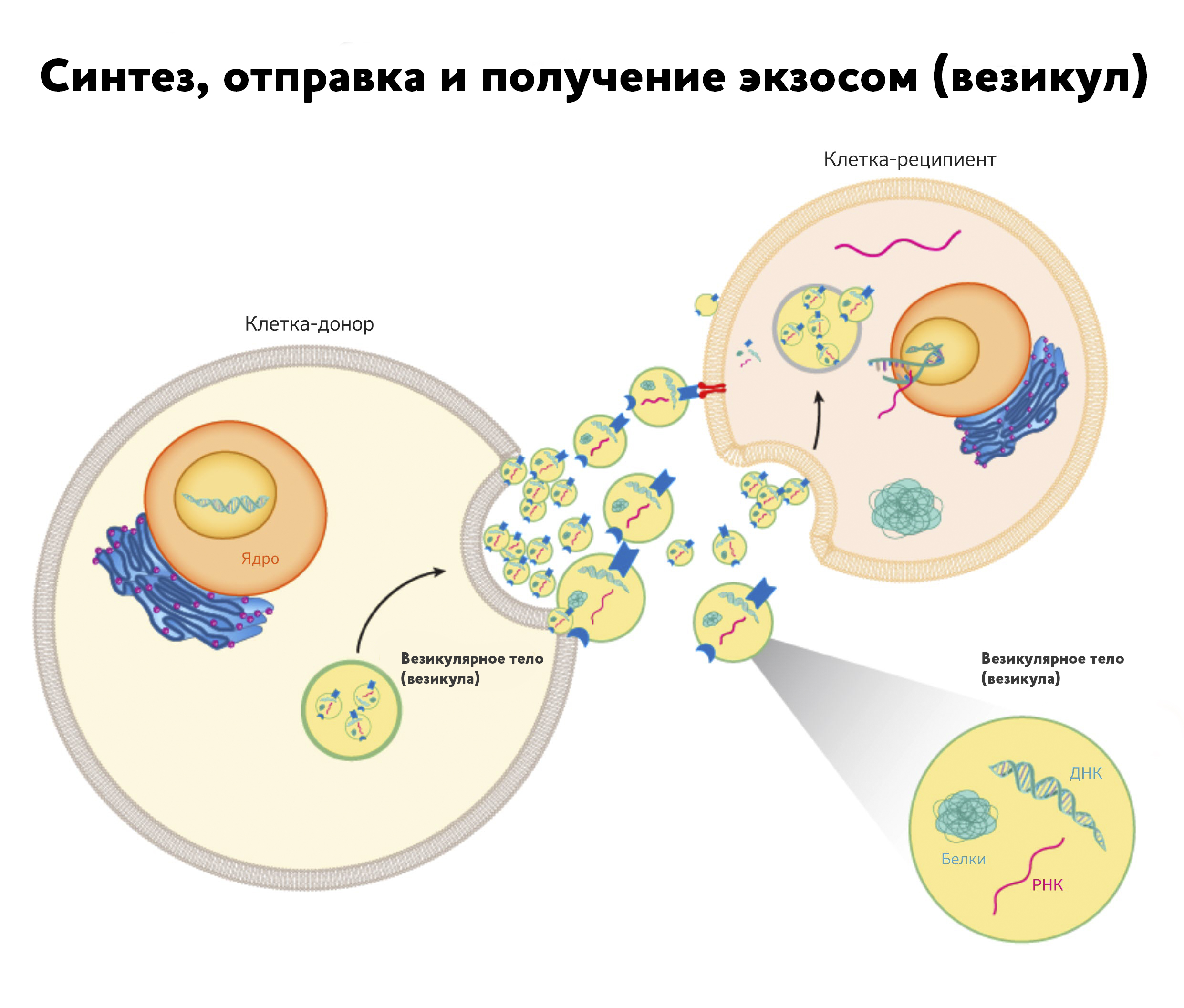 Везикулы попадают в межклеточное пространство, а затем и в остальные биологические жидкости, такие как кровь, слюна, спинномозговая жидкость и т.д. То есть они циркулируют во всех жидкостях человеческого организма. Эти биоструктуры переносят сигнальные или структурные молекулы между клетками анатомически отдаленных тканей и таким образом влияют на биологию и жизнедеятельность клеток-реципиентов.