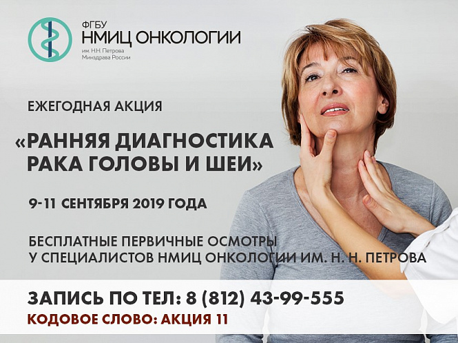 С 9 по 11 сентября Центр онкологии им. Н. Н. Петрова проведёт ежегодную акцию «Ранняя диагностика рака головы и шеи». Жители Петербурга смогут пройти бесплатный первичный осмотр у ведущих специалистов НМИЦ. Цель мероприятия – выявление злокачественных новообразований на ранних стадиях.